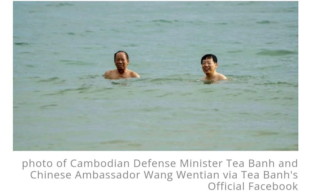 ယခုလအစောပိုင်းက ကမ္ဘောဒီးယားနိုင်ငံ Sihknoukville ဒေသတွင် တရုတ်နိုင်ငံမှတည်ဆောက်သော ရေတပ်အခြေစိုက်စခန်းဖွင့်ပွဲအပြီးတွင် ကမ္ဘောဒီးယားနိုင်ငံ၏ကာကွယ်ရေးဝန်ကြီး မစ္စတာ Tea Banh နှင့် တရုတ်သံအမတ် မစ္စတာ Wang Wentian တို့ အတူတူရေကူးခဲ့ကြသည့် ဓာတ်ပုံများလည်းပေါ်ထွက်လာခဲ့သည်။Ream ရေတပ်အခြေစိုက်စခန်းသည် အရှေ့တောင်အာရှတွင် တရုတ်၏ပထမဆုံး ရေတပ်စခန်းဖြစ်သည်။