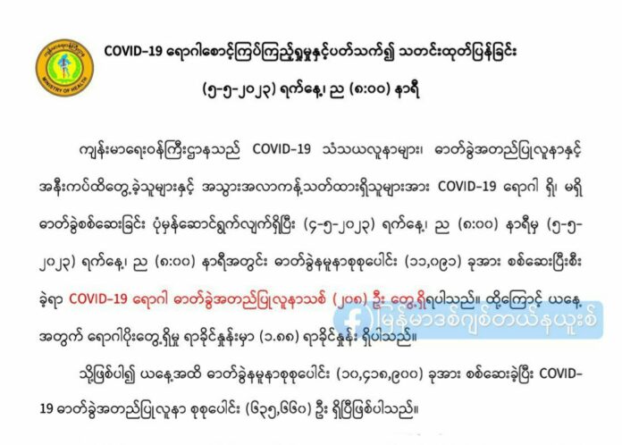 ကျန်းမာရေးဝန်ကြီးဌာနမှ ကိုဗစ်(၁၉)သံသယလူနာများ၊ဓာတ်ခွဲအတည်ပြုလူနာနှင့်အနီးကပ်ထိတွေ့ခဲ့သူများနှင့်အသွားအလာကန့်သတ်ထားရှိသူများအား ကိုဗစ်(၁၉)ရောဂါရှိ/မရှိ ဓာတ်ခွဲစစ်ဆေးခြင်းအား ပုံမှန်ဆောင်ရွက်လျက်ရှိသည်။
