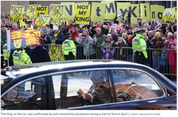 ထို့ကြောင့် သမ္မတစနစ် လိုလားသူများသည် နန်းတက်ပွဲအတွက် ချားလ်စ်ဘုရင် စီးတန်းလှည့်လည်မည့် လမ်းကြောင်းတစ်လျှောက်တွင် ဘုရင်စနစ်ကို ရှုတ်ချသည့် ပိုစတာများ ကိုင်ဆောင်၍ ဆန္ဒထုတ်ဖော်ခွင့်ရရှိမည် ဖြစ်သည်။