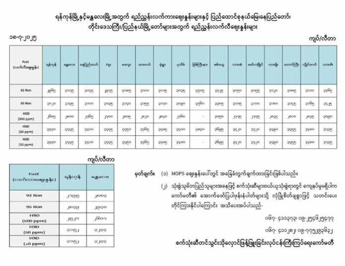 ထို့ပြင် လက်လီစျေးနှုန်းအနေဖြင့် 92 Ron တစ်လီတာလျင်(၂,၇၉၅)ကျပ်၊ 95 Ron တစ်လီတာလျင် (၂,၈၄၉)ကျပ်၊ HSD(500 ppm) တစ်လီတာလျင် (၂,၅၂၇)ကျပ်၊ HSD(50 ppm)တစ်လီတာလျင် (၃,၀၅၂)ကျပ်၊ HSD(10 ppm)တစ်လီတာလျင် (၃,၀၅၂)ကျပ်တို့ဖြစ်ကြောင်း သိရသည်။