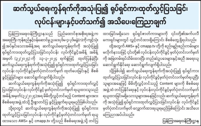 ဆက်သွယ်ရေးကွန်ရက်ကို အသုံးပြု၍ ရုပ်ရှင်ကားထုတ်လွှင့်ပြသခြင်း လုပ်ငန်းလုပ်ကိုင်ခွင့် မှတ်ပုံတင်လက်မှတ်ရယူထားသော AWS+ နှင့် cmapp.tv တို့သည် စိစစ်ရေးအဖွဲ့သို့တင်ပြထားခြင်းမရှိသော ရုပ်ရှင်ဇာတ်ကားများကို ၎င်းတို့ ၏ အက်ပလီကေးရှင်းများတွင် လွှင့်တင်ထားရှိကြောင်း စိစစ်တွေ့ရှိခဲ့ရကြောင်း ပြန်ကြားရေးဝန်ကြီးဌာန ယနေ့ ဩဂုတ် (၆)ရက်တွင် အသိပေးထုတ်ပြန်ထားသည်။