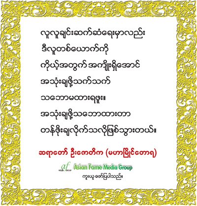 HomeDhammaDhamma Quotesဆရာေတာ္ ဦးေဇာတိက (... ဆရာေတာ္ ဦးေဇာတိက ( မဟာၿမိဳင္ေတာရ ) ၏ တရားဓမၼ Written by Popular December 23, 2016 Estimated reading time: Less than 1 minutes FacebookInstagramTwitter Local News ယနေ့ မင်္ဂလာတောင်ညွှန့် နေအိမ်တိုက်ခန်းမီးလောင်မှုဖြစ်စဥ်၌ မွေးကင်းစကလေးငယ် ၁ ဦးအပါအဝင် ၅ ဦးမီးခိုးမွှန်၍ ဆေးရုံပို့ခဲ့ရ Popular - Local News ကောလင်းနှင့် ဘုတလင်တွင် လက်နက်ကိုင်အဖွဲ့များ၏ လက်နက်ကြီးဖြင့် ပစ်ခတ်မှုကြောင့် ကိုရင် (၂)ပါးနှင့် ကလေးငယ်(၂)ဦး ဒဏ်ရာရ Popular - Local News ပုဂ္ဂလိကဆေးရုံအသစ်များ လိုင်စင်ချပေးရန် ကွင်းဆင်းစစ်ဆေးနေဟု ကျန်းမာရေးဝန်ကြီးပြော Popular - Local News ဖိလစ်ပိုင်နိုင်ငံတွင် လူကုန်ကူးခံရသည့် မြန်မာနိုင်ငံသား (၂၁) ဦးအနက် ပထမအသုတ်အဖြစ် (၄)ဦးအား ပြန်လည်ပို့ဆောင် Popular - Load more Ads Space Available Boost your brand’s visibility with prime ad space on our website—reach your audience effectively and drive results! Call Us at: 09-420209071 Contact Us ထိုင်းရောက်မြန်မာအလုပ်သမားအချို့ စာရွက်စာတမ်းအတုများဖြင့် လိမ်လည်တင်ပြ၍ လျော်ကြေးငွေတောင်းခံမှုများရှိနေ Popular Journal - December 13, 2025 Local News ထိုင်းရောက်မြန်မာအလုပ်သမားအချို့ စာရွက်စာတမ်းအတုများဖြင့် လိမ်လည်တင်ပြ၍ လျော်ကြေးငွေတောင်းခံမှုများရှိနေ Popular Journal - Local News ပွဲချိန်တွင်ပင် မြန်မာ – အင်ဒိုနီးရှား အမျိုးသမီးဖူဆယ်ပွဲစဥ် ပထမပိုင်းတွင် မြန်မာအသင်း (၃) ဂိုး ရှုံးနိမ့်နေ Popular Journal - Local News လွိုင်ကော်စက်မှုဇုန်အတွင်း စက်မှုလုပ်ငန်းများ ပြန်လည်လည်ပတ်နေ Popular Journal - Local News သံဖြူဇရပ်မြို့နယ် ပငစံပြကျေးရွာတွင် မွန်ညီညွတ်ရေးပါတီ၏ အောင်နိုင်ရေးဆိုင်းဘုတ် စိုက်ထူ Popular Journal - Continue reading Popular - February 15, 2023 Local Newsယနေ့ မင်္ဂလာတောင်ညွှန့် နေအိမ်တိုက်ခန်းမီးလောင်မှုဖြစ်စဥ်၌ မွေးကင်းစကလေးငယ် ၁ ဦးအပါအဝင် ၅ ဦးမီးခိုးမွှန်၍ ဆေးရုံပို့ခဲ့ရ ရန်ကုန်တိုင်း၊ မင်္ဂလာတောင်ညွှန့်မြို့နယ်၊ ရေတွင်းကုန်းရပ်ကွက်ရှိ နေအိမ်တိုက်ခန်းတစ်ခု၏ ဒုတိယထပ်တွင် ဖေဖော်ဝါရီ ၁၅ ရက်(ယနေ့)မွန်းလွဲပိုင်းက Level 1 အဆင့်မီးလောင်မှုဖြစ်စဥ်တွင် မွေး ကင်းစကလေးငယ် ၁ ဦးအပါအဝင် ၅ ဦးမီုးခိုးမွှန်သွား၍ ဆေးရုံသို့ပို့ဆောင်ပေးခဲ့ရကြောင်း သိရသည်။ ယနေ့မွန်းလွဲ ၂ နာရီ ၅၀ မိနစ်ခန့်က မင်္ဂလာတောင်ညွန့်မြို့နယ်၊ ရေတွင်းကုန်းရပ်ကွက်၊ (၁၂၂)လမ်း ၏ နေအိမ်တိုက်ခန်းတစ်ခု၏ဒုတိယထပ်ရှိ လျှပ်စစ်ပစ္စည်းဆိုင်မှ မီးစတင်လောင်ကျွမ်းခဲ့ခြင်းဖြစ် သည်။ မီးလောင်မှုအား တာမွေမြို့နယ်မီးသတ်စခန်း၊ မင်္ဂလာတောင်ညွန့်မြို့နယ်မီးသတ်စခန်းတို့မှတပ်ဖွဲ့ဝင်များနှင့် လူမှုကူညီရေးအသင်းများက Level 1 အဆင့်ဖြင့် ဝိုင်းဝန်းငြှိမ်းသတ်ခဲ့ကြသဖြင့် နေ့လည်... Popular - February 15, 2023 Local Newsကောလင်းနှင့် ဘုတလင်တွင် လက်နက်ကိုင်အဖွဲ့များ၏ လက်နက်ကြီးဖြင့် ပစ်ခတ်မှုကြောင့် ကိုရင် (၂)ပါးနှင့် ကလေးငယ်(၂)ဦး ဒဏ်ရာရ စစ်ကိုင်းတိုင်း၊ ကောလင်းနှင့် ဘုတလင်မြို့တို့တွင်