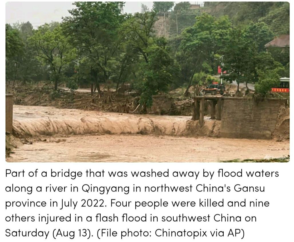 တရုတ်နိုင်ငံ အနောက်တောင်ပိုင်းတွင် သြဂုတ်လ ၁၃ ရက် စနေနေ့က ရေလွှမ်းမိုးမှုကြောင့် လူလေးဦးသေဆုံးပြီး ကိုးဦး ထက်မနည်းဒဏ်ရာရရှိခဲ့ကြောင်း ဒေသဆိုင်ရာ အာဏာပိုင်များက ပြောကြားခဲ့သည်။