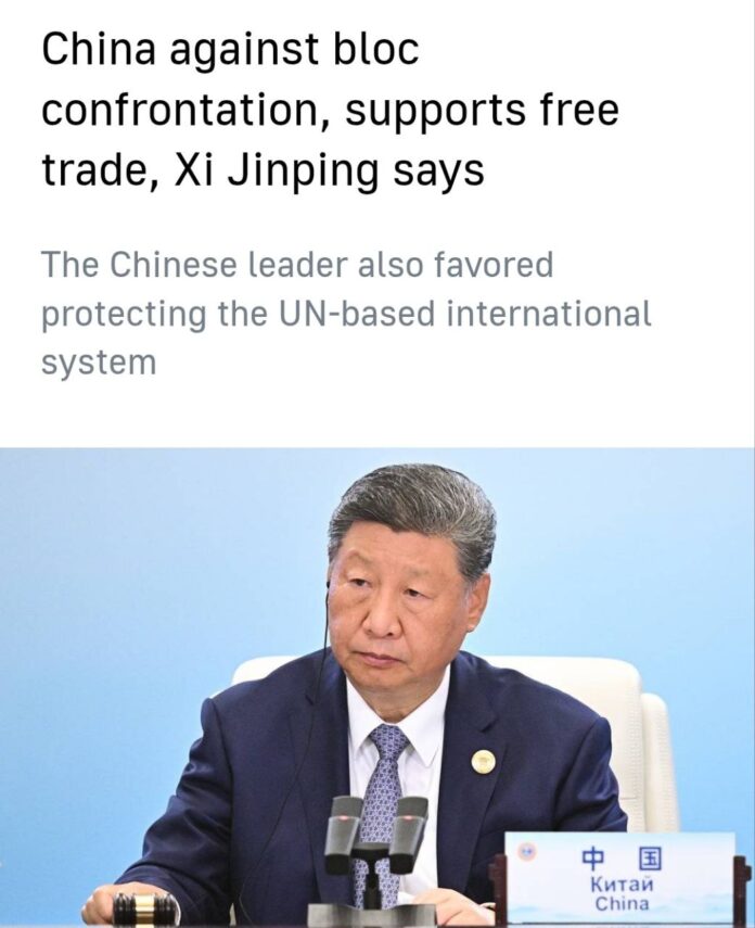 တရုတ်နိုင်ငံသည် ရှန်ဟိုင်း ပူးပေါင်းဆောင်ရွက်ရေးအဖွဲ့ (SCO) မှ မိတ်ဖက်များနှင့်အတူ ဖိနှိပ်မှုနှင့် အုပ်စုဖွဲ့ ထိပ်တိုက်ရင်ဆိုင်ခြင်းကိိုဆန့်ကျင်ပြီး လွတ်လပ်သော ကုန်သွယ်ရေးကို ထောက်ခံကြောင်း တရုတ်သမ္မတ ရှီကျင့်ဖိန်က တရုတ်နိုင်ငံ၊ တီယန်ကျင်းမြို့၌ ကျင်းပသည့် ရှန်ဟိုင်း ပူးပေါင်းဆောင်ရွက်ရေးအဖွဲ့ (SCO) နိုင်ငံအကြီးအကဲများကောင်စီ အစည်းအဝေးတွင် ပြောကြားသည်။