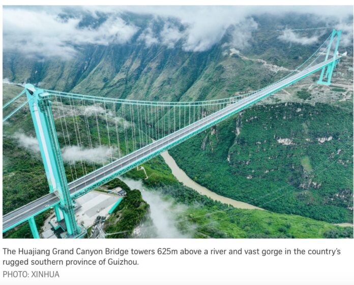 တရုတ်နိုင်ငံတွင် ကမ္ဘာအမြင့်ဆုံးတံတားကို စက်တင်ဘာလ ၂၈ ရက်နေ့က ဖွင့်လှစ်ပေးခဲ့သည်။ သုံးနှစ်ကြာ တည်ဆောက်ခဲ့သောတံတားကြီးသည် အဆိုပါပြည်နယ်မှာပင်ရှိသည့် အခြားတံတားတစ်စင်း၏ စံချိန်ကိုချိုးဖျ-က်နိုင်ခဲ့သည်။