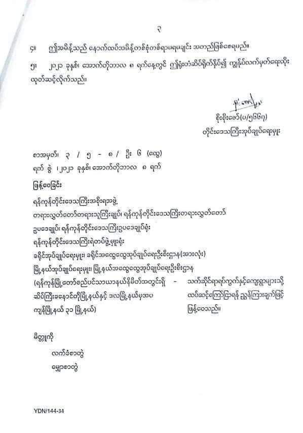 ဒီအမိန့်ထုတ်ပြန်ချက်ကို ရန်ကုန်တိုင်း အုပ်ချုပ်ရေးမှူးက လက်မှတ်ရေးထိုးထုတ်ပြန်လိုက်တာဖြစ်ပြီး တခြားအမိန့်တစုံတရာ မရမချင်း အတည်ဖြစ်တယ်လို့ ဖော်ပြထားပါတယ်။