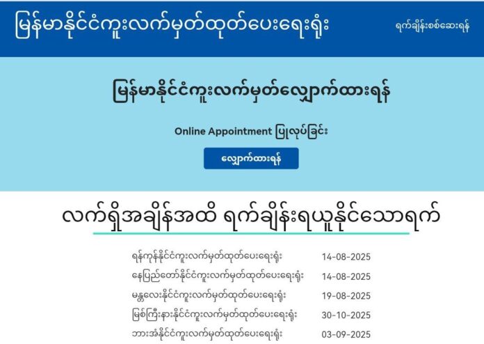 ရန်ကုန်နိုင်ငံကူး လက်မှတ်ထုတ်ပေးရေးရုံး၊ နေပြည်တော်နိုင်ငံကူးလက်မှတ်ထုတ်ပေးရေးရုံး၊ မော်လမြိုင်နိုင်ငံကူးလက်မှတ်ထုတ်ပေးရေးရုံး၊ စစ်တွေနိုင်ငံကူးလက်မှတ်ထုတ်ပေးရေးရုံး၊ ပုသိမ်နိုင်ငံကူးလက်မှတ်ထုတ်ပေးရေးရုံး၊ ပဲခူးနိုင်ငံကူးလက်မှတ်ထုတ်ပေးရေးရုံး၊ မုံရွာနိုင်ငံကူးလက်မှတ်ထုတ်ပေးရေးရုံးတို့တွင် နိုင်ငံကူးလက်မှတ်ကိစ္စနှင့် ပတ်သက်၍ ဩဂုတ် (၁၄) ရက်သို့ ရက်ချိန်းပေးထားပြီး မကွေးနိုင်ငံကူးလက်မှတ်ထုတ်ပေးရေးရုံး၊ မန္တလေးနိုင်ငံကူးလက်မှတ်ထုတ်ပေးရေးရုံး၊ တောင်ကြီးနိုင်ငံကူးလက်မှတ်ထုတ်ပေးရေးရုံး၊ ထားဝယ်နိုင်ငံကူးလက်မှတ်ထုတ်ပေးရေးရုံး၊ ကျိုင်းတုံနိုင်ငံကူးလက်မှတ်ထုတ်ပေးရေးရုံးတို့တွင် ဩဂုတ် (၁၅) ရက်မှ ဩဂုတ် (၂၉)ရက်အထိ နှစ်ပတ်အတွင်း ရက်ချိန်းများချိန်းဆိုထားကြောင်း သိရသည်။