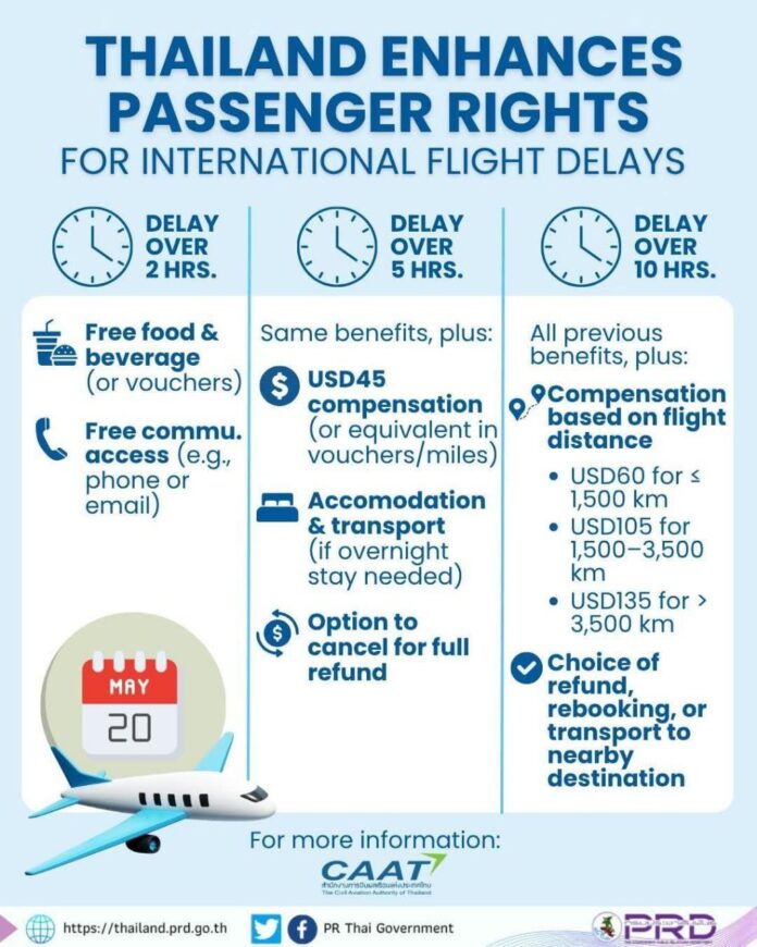 ထိုင်းနိုင်ငံသည် လေကြောင်းခရီးသွားများကို အကာအကွယ်ပေးရန် အရှိန်မြှင့်လုပ်ဆောင်နေပြီဖြစ်သည်။ CAB ၏ညွှန်ကြားချက် အမှတ်စဥ် ၁၀၁ အရ နိုင်ငံတကာလေကြောင်းခရီးစဉ်များအသိပေးခြင်းမရှိဘဲ နှောင့်နှေးခြင်း သို့မဟုတ် ဖျက်သိမ်းခြင်းများရှိပါက ခရီးသည်များအား အစားအသောက်၊ သယ်ယူပို့ဆောင်ရေး၊ ငွေကြေးလျော်ကြေး၊ ပြန်အမ်းငွေ၊ ပြန်လည်ဘွတ်ကင်လုပ်ခြင်း သို့မဟုတ် ဟိုတယ်တည်းခိုခွင့်များကိုကြန့်ကြာမှုအချိန်ပေါ်မူတည်၍ ခံစားခွင့်ရှိတော့မည်ဖြစ်သည်။
