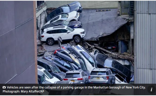 အမေရိကန်နိုင်ငံ နူးယော့ခ်မြို့ရှိ မန်ဟက်တန် စီရင်စု၏ အောက်ဘက်ပိုင်းတွင် ဧပြီလ ၁၈ ရက် အင်္ဂါနေ့က ယာဉ်ရပ်နားရာ အဆောက်အအုံတစ်ခု ပြိုကျခဲ့ရာ အလုပ်သမား တစ်ဦး သေဆုံးပြီး လူငါးဦး ဒဏ်ရာရရှိခဲ့ကြောင်း နူးယော့ခ် မီးသတ်ဌာန၏ ကယ်ဆယ်ရေး အကြီးအကဲက ပြောကြားခဲ့သည်။