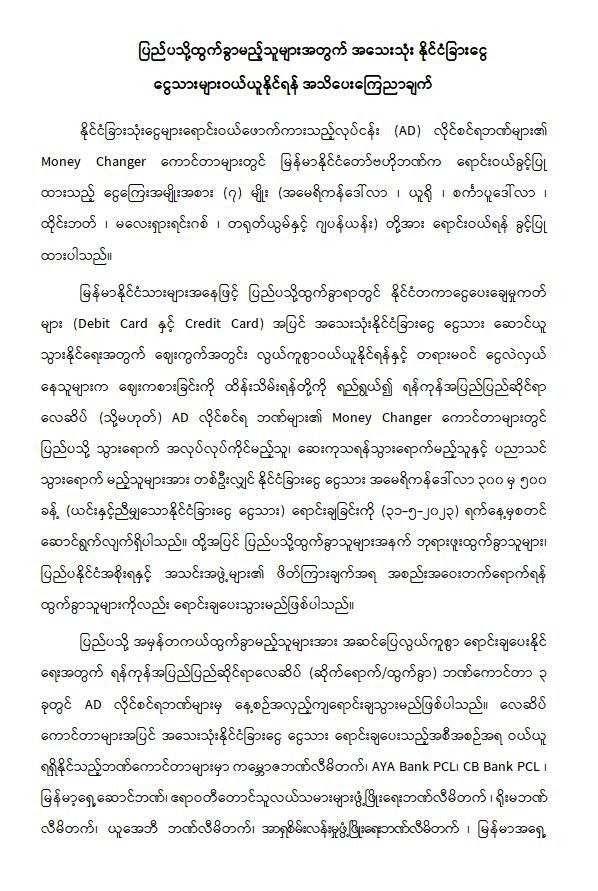 ရန်ကုန်လေဆိပ်မှတဆင့် ပြည်ပသို့အမှန်တကယ်ထွက်ခွာမည့်သူများ အသေးသုံးနိုင်ငံခြားငွေ ငွေသားဝယ်ယူရာတွင် အဆင်ပြေလွယ်ကူစေရန် နိုင်ငံခြားသုံးငွေများရောင်းဝယ်ဖောက်ကားသည့်လုပ်ငန်း(AD)လိုင်စင်ရဘဏ် ၁၂ ခုမှ ရန်ကုန်လေဆိပ်ရှိ ဘဏ်ကောင်တာ ၃ခုတွင် နေ့စဥ်အလှည့်ကျရောင်းချပေးသွားမည်ဖြစ်ကြောင်း ဗဟိုဘဏ်ကကြေညာခဲ့သည်။