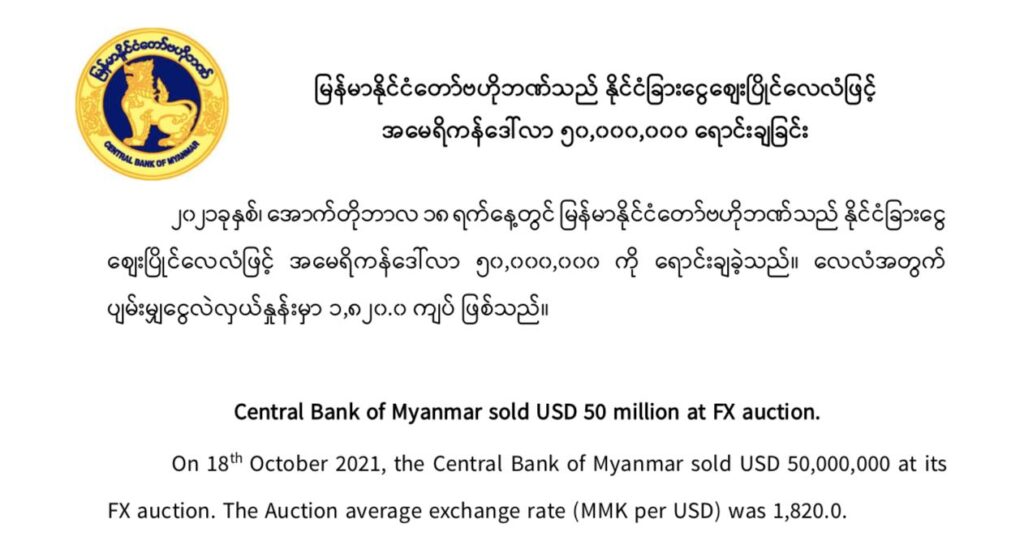 ယနေ့ (အောက်တိုဘာလ ၁၈ရက်နေ့) မှာ ဗဟိုဘဏ်က ရည်ညွှန်းငွေလဲနှုန်း ၁၈၂၀ကျပ်နဲ့ အမေရိကန်ဒေါ်လာ သန်း ၅၀ ထုတ်ရောင်းလိုက်ပါတယ်။