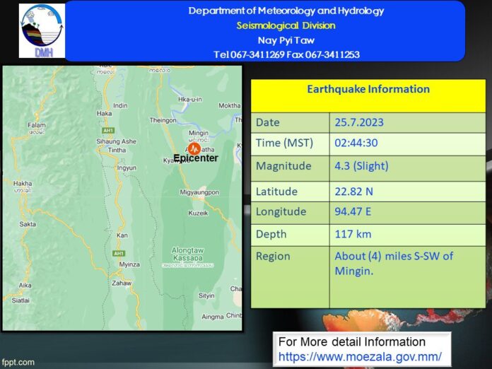 ၂၀၂၃ ခုနှစ်၊ ဇူလိုင်လ (၂၅) ရက်နေ့၊ မြန်မာစံတော်ချိန် (၀၂) နာရီ၊ (၄၄) မိနစ်၊ (၃၀) စက္ကန့် အချိန်တွင် ဟားခါးမြေငလျင်စခန်းမှ အရှေ့-အရှေ့မြောက်ဘက် (၅၇) မိုင်ခန့်ကွာဝေးသော မြန်မာနိုင်ငံ ပြည်တွင်း (မင်းကင်းမြို့၏ တောင်-အနောက်တောင်ဘက် (၄) မိုင်ခန့်အကွာ)၊ မြောက်လတ္တီတွဒ် (၂၂.၈၂) ဒီဂရီ၊ အရှေ့လောင်ဂျီ တွဒ် (၉၄.၄၇) ဒီဂရီ၊ အနက် (၁၁၇) ကီလိုမီတာကို ဗဟိုပြု၍ အင်အား ရစ်(ခ်)တာစကေး (၄.၃) အဆင့်ရှိ အင်အားအနည်းငယ်ရှိသော မြေငလျင်တစ်ခု လှုပ်ရှားသွားကြောင်း မိုးဇလက ထုတ်ပြန်ကြေညာထားသည်။