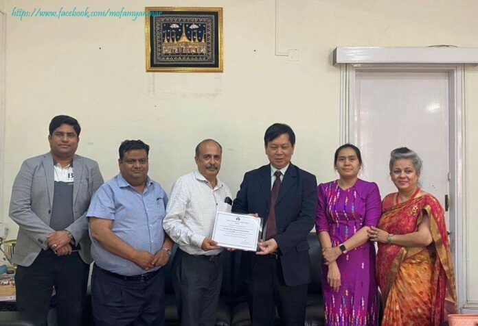 အိန္ဒိယနိုင်ငံ Aruna Abhay Oswal Trust ၏ ဥက္ကဋ္ဌ Mrs. Aruna Oswal လှူဒါန်းသည့် ရူပီး ၁၂၅၀၀၀ အား Indo – Myanmar Friendship Association ၏ General Secretary ဖြစ်သည့် Mr. Gaurav Gupta က မေ (၂၃) ရက်တွင် မြန်မာသံရုံးသို့ လာရောက်လှူဒါန်းရာ မြန်မာသံအမတ်ကြီး ဦးမိုးကျော်အောင်မှ လက်ခံရယူခဲ့ခြင်း ဖြစ်သည်။