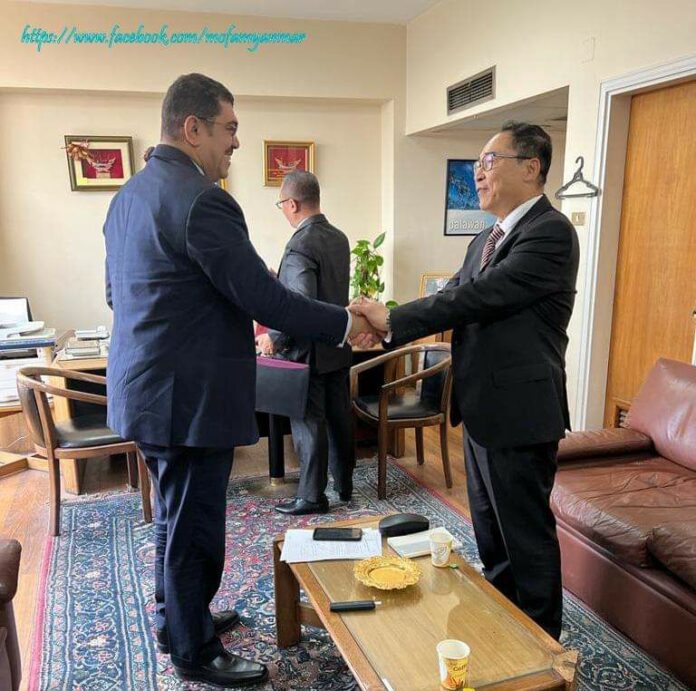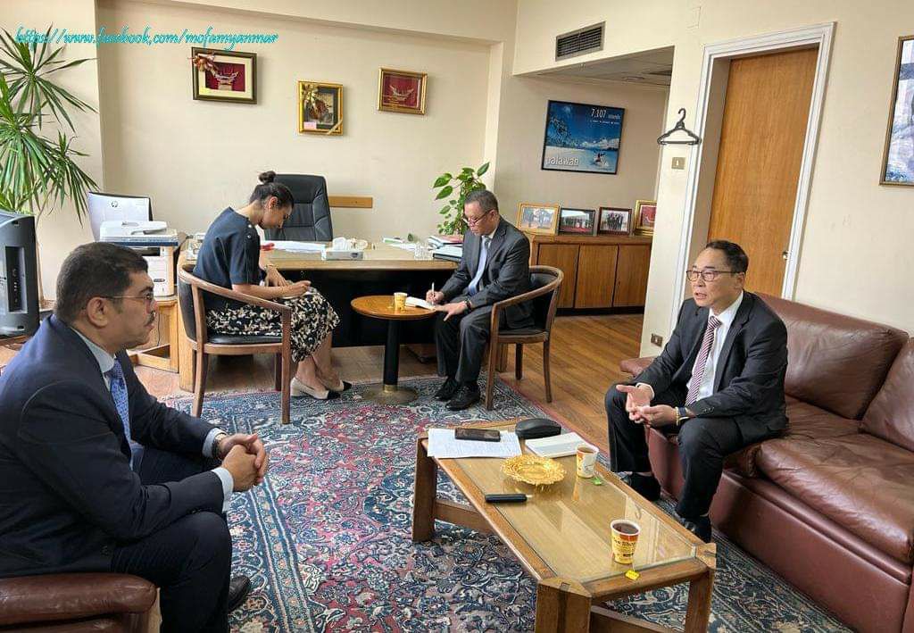 မြန်မာ – အီဂျစ် နှစ်နိုင်ငံ ကုန်သွယ်မှု မြှင့်တင်ရန် အစိုးရချင်းအပြင် ပုဂ္ဂလိက လုပ်ငန်းရှင်များ၊ စီးပွားရေးလုပ်ငန်းရှင်များကြား အပြန်အလှန်ပူးပေါင်းဆောင်ရွက်ရန် အီဂျစ်နိုင်ငံဆိုင်ရာ မြန်မာသံရုံး၊ ကိုင်ရိုမြို့မှ သံအမတ်ကြီးဦးမြင့်လွင်နှင့် အီဂျစ်နိုင်ငံ၊ နိုင်ငံခြားရေးဝန်ကြီးဌာန၊ အာရှရေးရာဦးစီးဌာန၊ အာဆီယံနိုင်ငံများဆိုင်ရာ တာဝန်ခံ ဒု – လက်ထောက်နိုင်ငံခြားရေးဝန်ကြီး Ambassador Haze m El Tahry တို့ တွေ့ဆုံဆွေးနွေးခဲ့ကြကြောင်း သိရသည်။