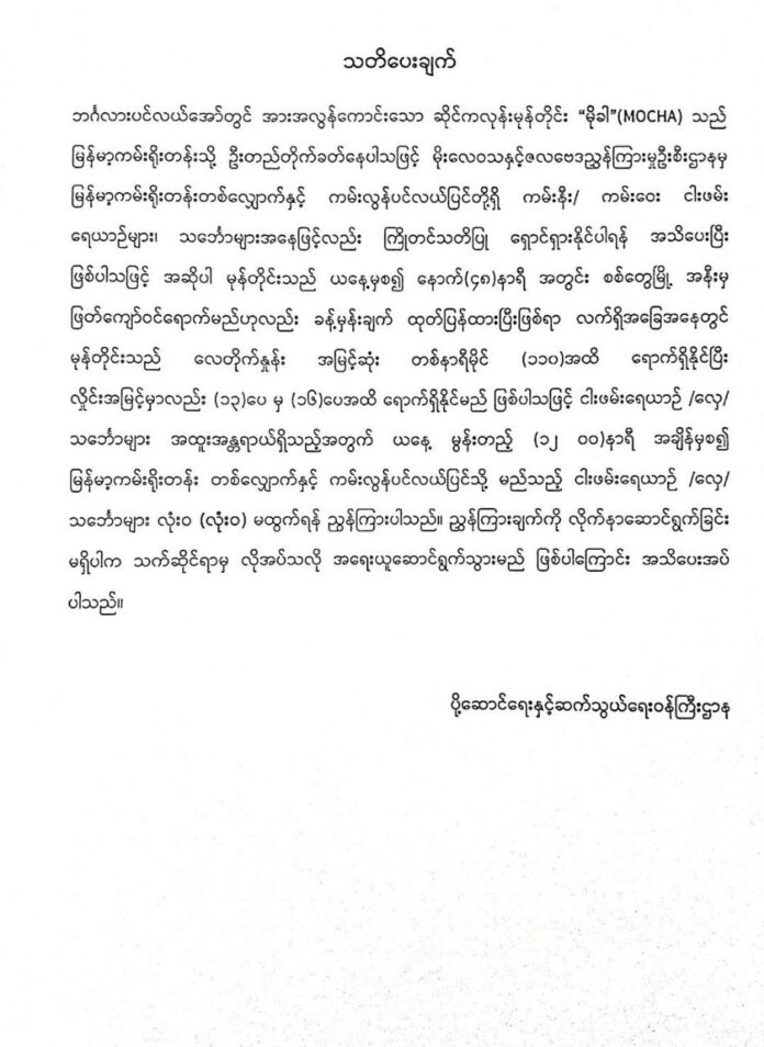 ဘင်္ဂလားပင်လယ်အော်တွင် ဖြစ်ပေါ်နေသည့် အားအလွန်ကောင်းသော ဆိုင်ကလုန်းမုန်တိုင်း “မိုခါ” (MOCHA) သ ည် မြန်မာ့ကမ်းရိုးတန်းသို့ ဦးတည်တိုက်ခတ်နေပါသသ ည့်အတွက် ယနေ့ မေလ (၁၂) ရက် မွန်းတည့် (၁၂) နာရီမှ စတင်ကာ မြန်မာ့ကမ်းရိုးတန်းတစ်လျှောက်နှင့် ကမ်းလွ န်ပင်လယ်ပြင်သို့ မည်သည့် ငါးဖမ်းရေယာဉ်/လှေ/ သ င်္ဘောများမှ ထွက်ခွာခြင်း လုံးဝမပြုရန် ပို့ဆောင်ရေးနှင့် ဆက်သွယ်ရေး ဝန်ကြီးဌာနက ညွှန်ကြားလိုက်သည်။