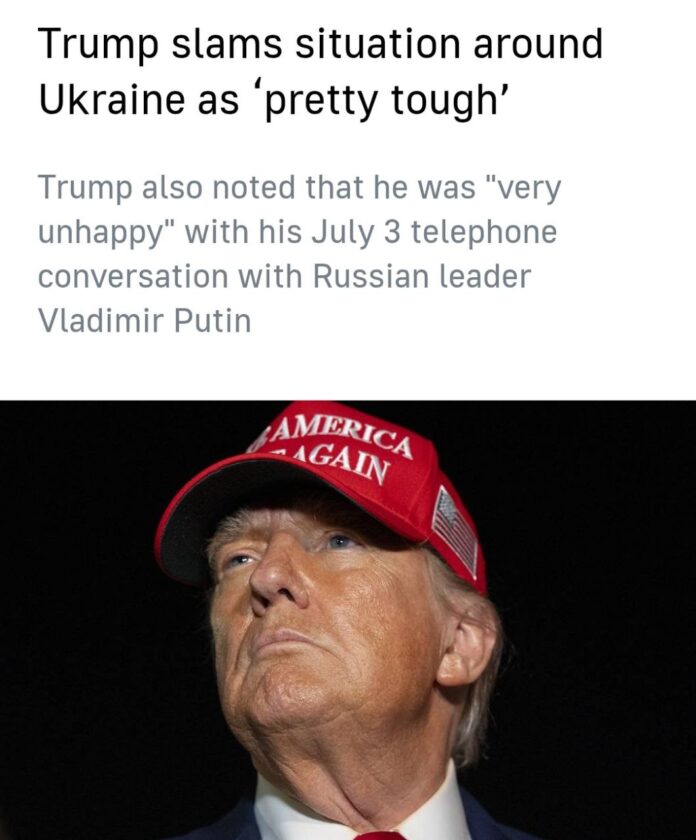ထရမ့်က ဇူလိုင် ၃ ရက် ရုရှားသမ္မတ ပူတင် နှင့် တယ်လီဖုန်းစကားပြောဆိုမှုကို “အတော်လေး မပျော်မရွှင်” ဖြစ်ခဲ့ကြောင်းလည်း ပြောကြားခဲ့သည်။ “သူက အဆုံးအထိ သွားချင်တယ်” ဟု ထရမ့်က ပြောကြားခဲ့ပြီး ယူကရိန်းပဋိပက္ခကို မော်စကို၏ ဖြေရှင်းလိုစိတ်အပေါ် သံသယဝင်ကြောင်း ဖော်ပြခဲ့သည်။ “ဒါ မကောင်းဘူး” ဟုလည်း သူက အလေးထားပြောကြားခဲ့သည်။