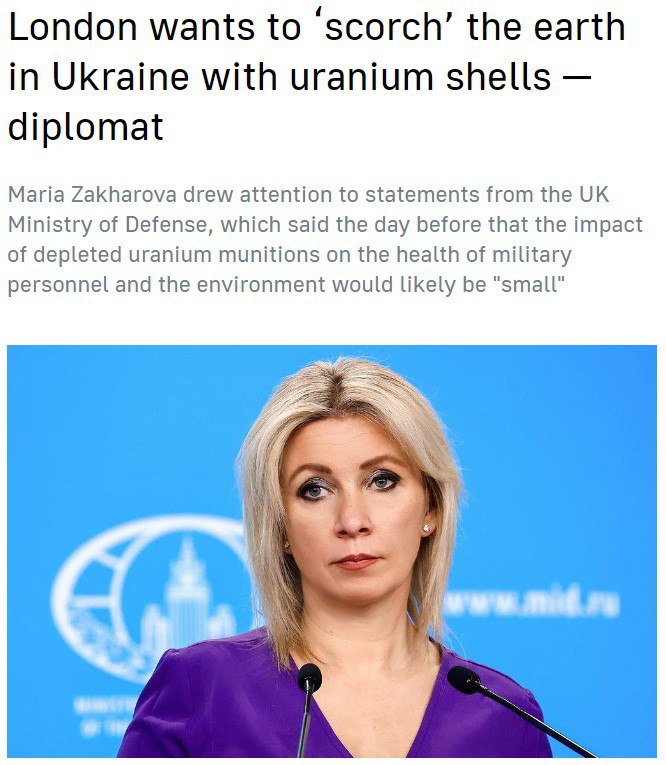 ဗြိတိန်နိုင်ငံသည် ယူရေနီယံပါဝင်သော လက်နက်ခဲယမ်းများအား ယူကရိန်းသို့ ထောက်ပံ့ပေးနေခြင်းဖြင့် ယူကရိန်းပိုင်နက်များကို မီးလောင်မြေအဖြစ် ပြောင်းလဲသွားစေရန်ပြုလုပ်နေကြောင်း ရုရှားနိုင်ငံခြားရေးဝန်ကြီးဌာန ပြောခွင့်ရပုဂ္ဂိုလ် မာရီယာဇခါရိုဗာ့က ပြောကြားလိုက်သည်။