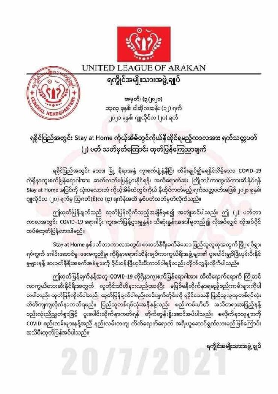 ရခိုင်ပြည်နယ် အတွင်း Covid 19 ရောဂါ ဆက်လက်မပြန့်ပွါးနိုင်ရန် နှင့် အထိရောက်ဆုံးကြိုတင်ကာကွယ်တားဆီးနိုင်ရန် မိမိနေအိမ်တွင် သာနေထိုင်ရမည့် Stay At Home ကာလအား ၂၀၂၁ခုနှစ်၊ ဇူလိုင်လ (၂၀)ရက်နေ့မှ ဩဂုတ်လ (၄)ရက်နေ့အထိ (၂)ပတ် သတ်မှတ်ကြေညာလိုက်ကြောင်း သိရသည်။