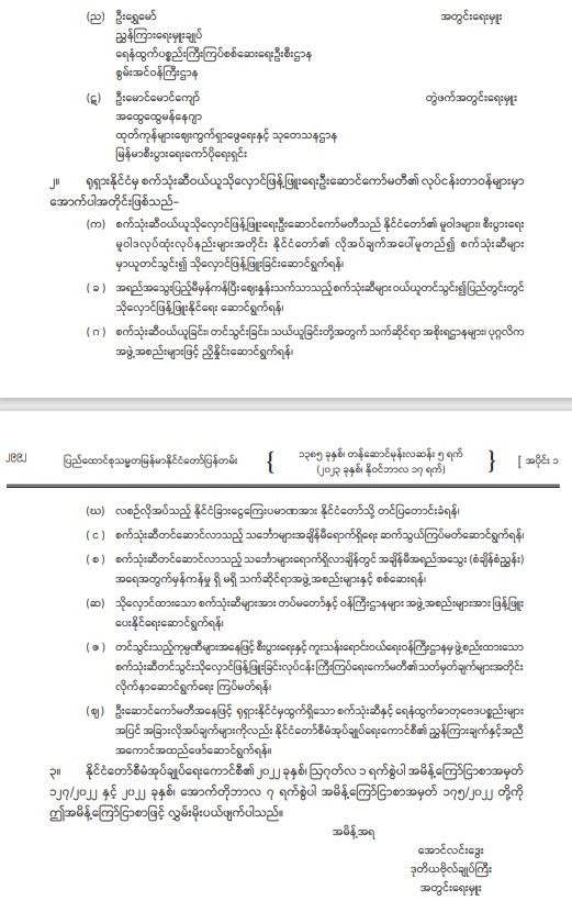 သိုလှောင်ထားသော စက်သုံးဆီများအား တပ်မတော်နှင့် ဝန်ကြီးဌာနများ အဖွဲ့အစည်းများအား ဖြန့်ဖြူးပေးနိုင်ရေးဆောင်ရွက်ရန်၊ တင်သွင်းသည့် ကုမ္ပဏီများအနေဖြင့် စီးပွားရေးနှင့် ကူးသန်းရောင်းဝယ်ရေးဝန်ကြီးဌာနမှ ဖွဲ့စည်းထားသော စက်သုံးဆီတင်သွင်းသိုလှောင်ဖြန့်ဖြူးခြင်းလုပ်ငန်း ကြီးကြပ်ရေးကော်မတီ၏ သတ်မှတ်ချက်များအတိုင်း လိုက်နာဆောင်ရွက်ရေး ကြပ်မတ်ရန်နှင့် ရုရှားနိုင်ငံမှထွက်ရှိသော စက်သုံးဆီနှင့် ရေနံထွက်ဓာတုဗေဒပစ္စည်းများ အပြင် အခြားလိုအပ်ချက်များကိုလည်း နိုင်ငံတော်စီမံအုပ်ချုပ်ရေးကောင်စီ၏ ညွှန်ကြားချက်နှင့်အညီ အကောင်အထည်ဖော်ဆောင်ရွက်ရမည်ဖြစ်ကြောင်း သိရသည်။