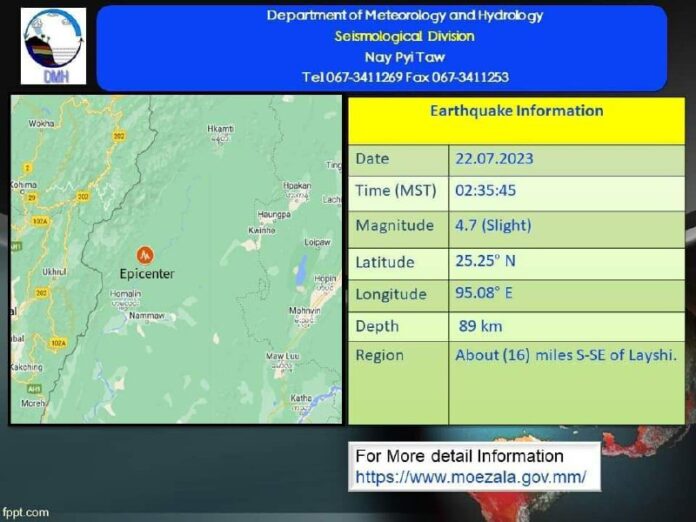ယမန်နေ့ည ၂ နာရီ ၃၅ မိနစ် ၄၅ စက္ကန့်ခန့်က လေရှီးမြို့၏ တောင်-အရှေ့တောင်ဘက်(၁၆)မိုင်ခန့်အကွာ)၊မြောက်လတ္တီတွဒ်(၂၅ ဒသမ ၂၅)ဒီဂရီ၊အရှေ့လောင်ဂျီတွဒ်(၉၅ ဒသမ ၀၈)ဒီဂရီ၊အနက် (၈၉)ကီလိုမီတာအားဗဟိုပြု၍ အင်အား ရစ်(ခ်) တာစကေး(၄ ဒသမ ၇)အဆင့်ရှိ အင်အားအနည်း ငယ်ရှိ ငလျင်လှုပ်ခတ်ခဲ့ကြောင်း သိရသည်။