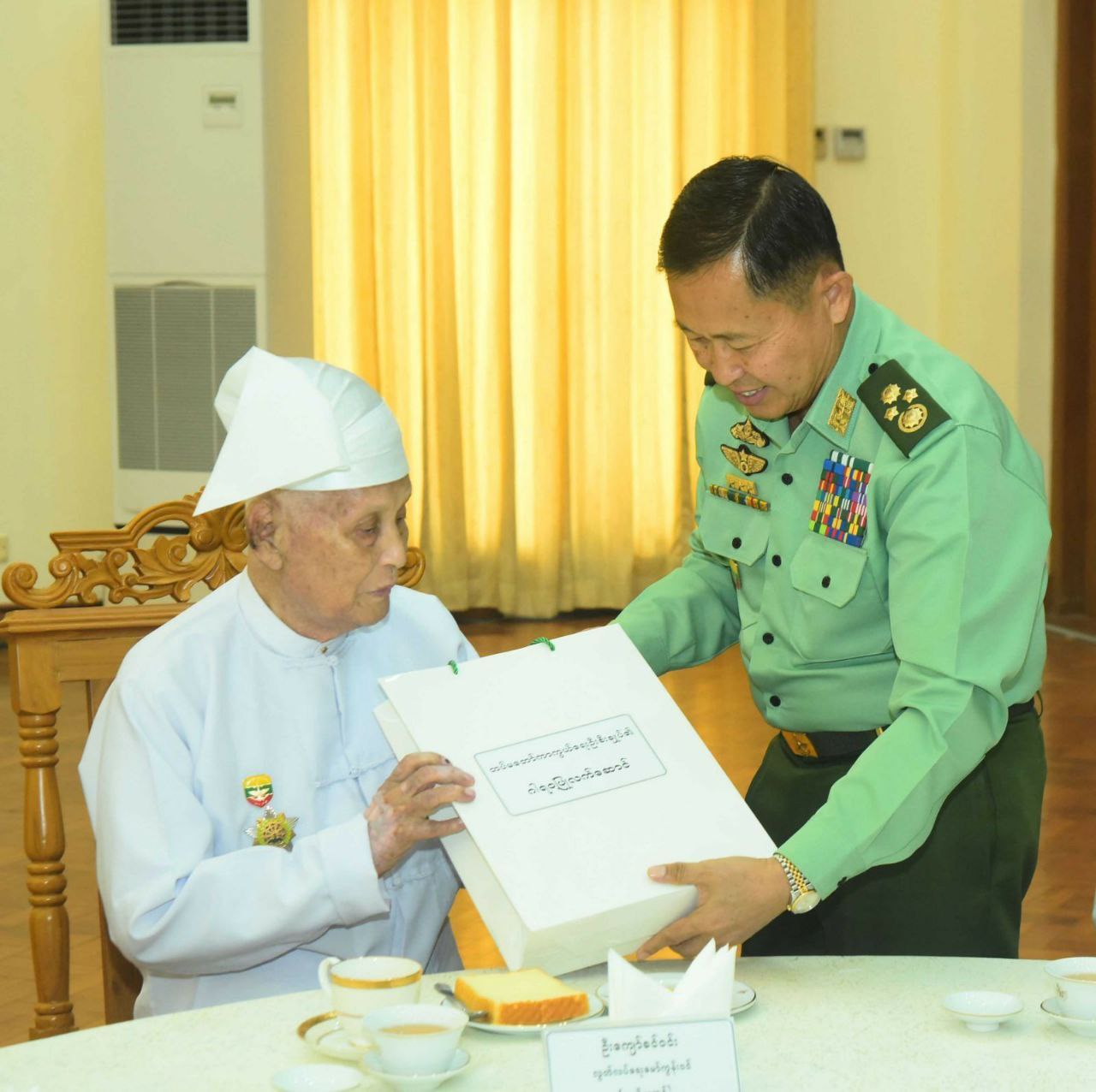 (၇၈)နှစ်မြောက် တပ်မတော်နေ့အခမ်းအနားသို့တက်ရောက်မည့် လွတ်လပ်ရေးမော်ကွန်းဝင်ပုဂ္ဂိုလ် ၅ ဦးအား နစက ဒု-ဥက္ကဋ္ဌနှင့်ဇနီးတို့က မတ် ၂၇ ရက်နံနက်က လက်ဖက်ရည်ဝိုင်းဖြင့်တည်ခင်းဧည့်ခံ၍ ဂါရ၀ပြုတွေ့ဆုံခဲ့သည်။