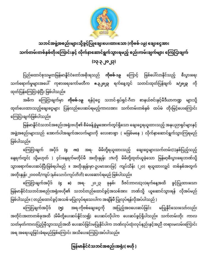ကိုဗစ်ချေးငွေကို အပြည့်အဝပေးဆပ်ခြင်း မပြုနိုင်သေးသော်လည်း အတိုင်းအတာတစ်ခုအထိ ပေးဆပ်လိုပါက ပေးဆပ်ခွင့်ရှိကြောင်း၊ သက်တမ်းတိုးကာလ သတ်မှတ်ကာလ ပြည့်မှီသွားသည်အထိ ပေးဆပ်ခြင်းမပြုနိုင်ပါက ဘဏ်လုပ်ထုံးလုပ်နည်းနှင့်အညီ တရားမလမ်းကြောင်းအရ အရေးယူခြင်းခံရမည်ဖြစ်ကြောင်း အသိပေးကြေငြာထားသည်။