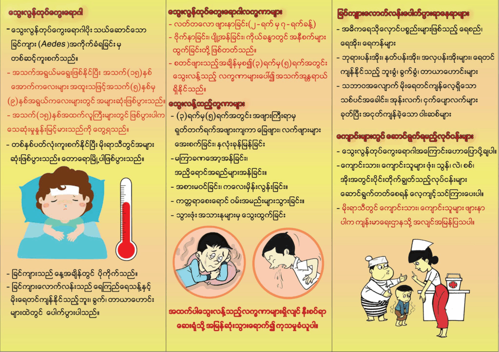 သွေးလွန်တုပ်ကွေးရောဂါ ကာကွယ်နှိမ်နင်းရေးအတွက် လိုအပ်သောဆေးနှင့် ဆေးပစ္စည်းများဖြစ်သည့် Abate (ပိုးလောက်လမ်းသေဆေး)၊ Fogging Machine (ခြင်ဆေးမှုတ်စက်)၊ သွေးလွန်တုပ်ကွေး အမြန်သွေးစစ်ကိရိယာ (RDT)၊ ကလေး သွေးပေါင်ချိန်တိုင်းကိရိယာ (Pediatric BP Cuff) တို့ကို ကုသရေးဦးစီးဌာနနှင့် တိုင်းဒေသကြီး/ပြည်နယ် ပြည်သူ့ကျန်းမာရေး ဦးစီးဌာနများသို့ ဖြန့်ဝေပေးထားပြီးဖြစ်သည်။