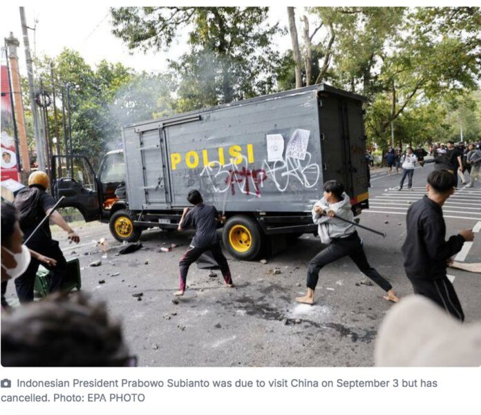 အင်ဒိုနီးရှားသမ္မတ ပရာဘိုဝို ဆူဘီယန်တိုသည် မြို့တော်ဂျကာတာအပြင်ဘက်တွင် ဒေသဆိုင်ရာပါလီမန်အဆောက် အအုံအချို့ မီးရှို့ခံရပြီး၊ ဆန္ဒပြပွဲများ ရက်ကြာရှည်လာသဖြင့် တရုတ်နိုင်ငံသို့ သွားရောက်ရန် စီစဉ်ထားသည့် ခရီးစဉ်ကို ဖျက်သိမ်းလိုက်ကြောင်းသိရသည်။