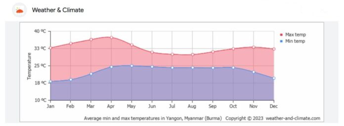 မတ်လ ဒုတိယအပတ်မှစတင်ပြီး ပူပြင်းသည့် ရာသီဥတုနှင့် အပူဒဏ်ကို ရန်ကုန်အပါအဝင် မြန်မာနိုင်ငံရှိ မြို့အများအပြားတွင် သိသိသာသာခံစားလာရကြောင်း၊ ရန်ကုန်မြို့ရှိ အပူချိန်သည်လည်း ယခုရက်ပိုင်းအတွင်း အမြင့်ဆုံးအပူချိန် ၃၈ ဒီဂရီစင်တီဂရိတ်အထိရှိကြောင်း သိရသည်။