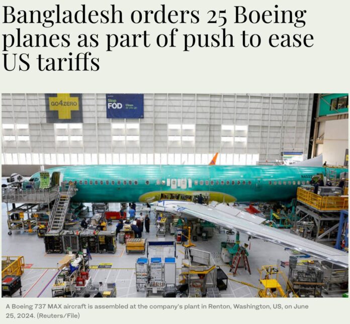 ကုန်သွယ်မှုဆိုင်ရာ တင်းမာမှုများ ပြေလျှော့စေရေးနှင့် ထရမ့်ပ်အစိုးရက ချမှတ်ထားသော အခွန်နှုန်းထား လျှော့ချပေးရေးအလို့ငှာ ဘင်္ဂလားဒေ့ရှ်က ဘိုးရင်းလေယာဉ် ၂၅ စီးကို မှာယူခဲ့သကဲ့သို့ အဓိကအမေရိကန်ကုန်ပစ္စည်းများကို ပိမို၍တင်သွင်းခဲ့ကြောင်း အကြီးတန်းအရာရှိတစ်ဦးက တနင်္ဂနွေနေ့တွင် ပြောကြားခဲ့သည်။