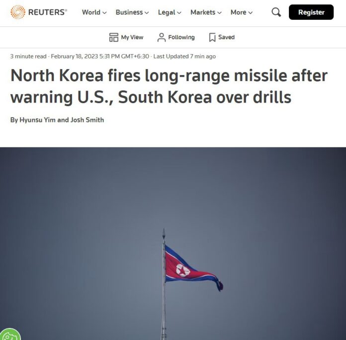 အမေရိကန်နှင့် တောင်ကိုရီးယားတို့ ပူးတွဲစစ်ရေးလေ့ကျင့်မှုအတွက် မြောက်ကိုရီးယားက သတိပေးပြီးနောက် တာဝေးပစ်ဒုံးကျည်တစ်စင်းကို ပစ်လွှတ်