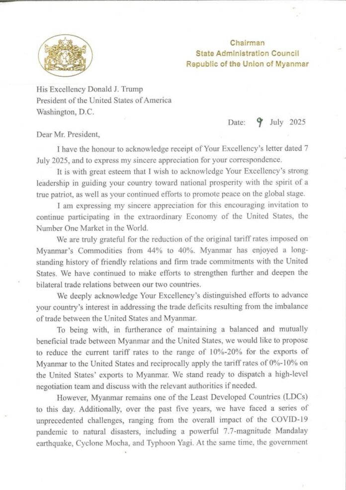 ဇူလိုင်လ ၁၁ ရက်နေ့က တပ်မတော် ကာကွယ်ရေးဦးစီးချုပ် ဗိုလ်ချုပ်မှူးကြီး မင်းအောင်လှိုင်က သမ္မတ ထရမ့်ထံ အခွန်ကိစ္စနှင့်ပတ်သက်၍ပြန်ကြားလွှာတွင် ” အခွန်စည်းကြပ်မှုများကို လျော့ချရေးအပြင် နှစ်နိုင်ငံလုံးနှင့် ပြည်သူများ၏ အကျိုးစီးပွားနှင့် သာယာဝပြောရေးကို အဟန့်အတား ဖြစ်စေသည့် မြန်မာနိုင်ငံအပေါ် ချမှတ်ထားသော စီးပွားရေး ပိတ်ဆို့အရေးယူမှုများကို ပြန်လည်စဉ်းစား ဖြေလျှော့ပေးရန် ” တို့ကိုထည့်သွင်း တောင်းဆိုခဲ့သည်။