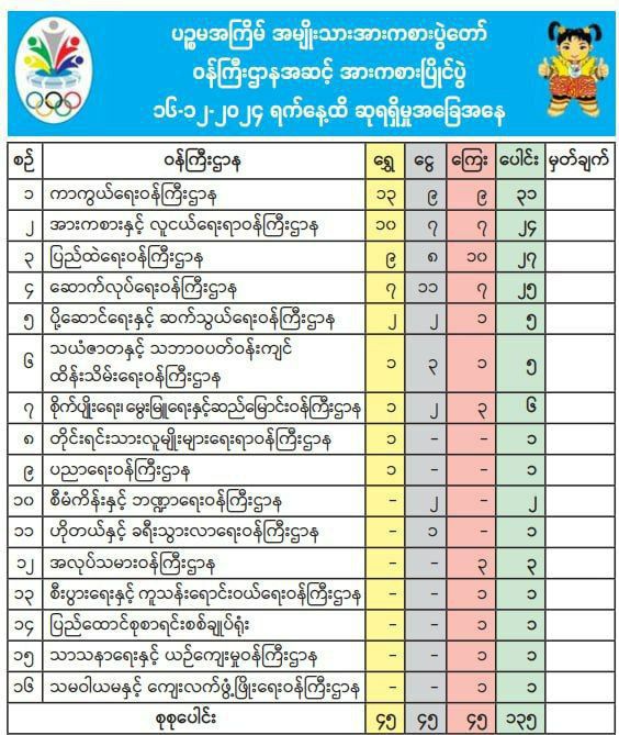 ကာကွယ်ရေးဝန်ကြီးဌာနအသင်းသည် ရွှေတံဆိပ် ၁၃ ခု၊ ငွေတံဆိပ် ၉ ခု၊ ကြေးတံဆိပ် ၉ ခု (စုစုပေါင်း ဆုတံဆိပ် ၃၁ ခု)ဖြင့် ဆုတံဆိပ်အများဆုံးရရှိကာ ထိပ်ဆုံးတွင်ရပ်တည်လျက်ရှိပြီး အားကစားနှင့်လူငယ်ရေးရာဝန်ကြီးဌာနမှ ရွှေတံဆိပ် ၁၀ ခု၊ ငွေတံဆိပ် ၇ ခု၊ ကြေးတံဆိပ် ၇ ခု (စုစုပေါင်း ဆုတံဆိပ် ၂၇ ခု)ဖြင့် ဒုတိယအများဆုံးရရှိထားကြောင်း သိရသည်။
