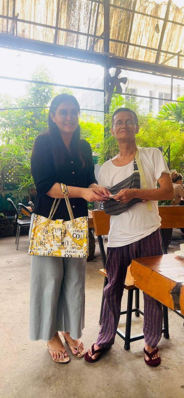 ” ခရီးသွားရမှာမို့ ကားစစ်ရင်း စောင့်နေတုန်း လဘက်ရည်ဆိုင်မှာမမျှော်လင့်ပဲ သရုပ်ဆောင် ဦးဗေလုဝ ကို တွေ့လို့နှုတ်ဆက်တော့ ဝမ်းသာအားရ ပြန်နှုတ်ဆက်ရှာတယ် လက်က ဘာဖြစ်လဲ မေးတော့ ဘေးက ပါလာတဲ့သူက လေဖြတ်ထားတာတဲ့ ဦးဗေ စကား သိပ်မပြောနိုင်သေးဘူးတဲ့ စိတ်မကောင်းလို့ ဆေးဖိုးလေး လှူခဲ့ပါတယ် ” လို့သူမလက်ရှိအသုံးပြုနေတဲ့လူမှုကွန်ယက်စာမျက်နှာမှာရေးသားခဲ့ပါတယ်။