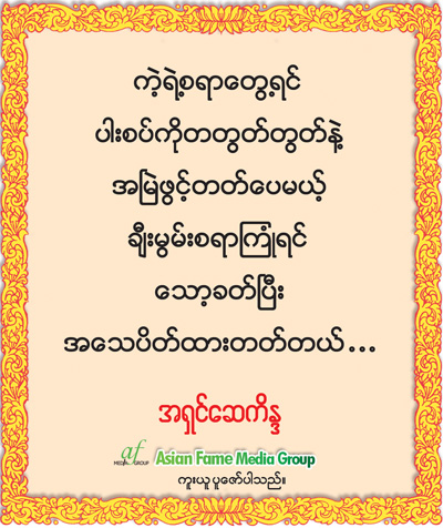 HomeDhammaDhamma Quotesအရွင္ေဆကိႏၵ ရဲ႕ တရားဓမၼ အရွင္ေဆကိႏၵ ရဲ႕ တရားဓမၼ Written by Popular October 8, 2016 Estimated reading time: Less than 1 minutes FacebookInstagramTwitter Local News ယနေ့ မင်္ဂလာတောင်ညွှန့် နေအိမ်တိုက်ခန်းမီးလောင်မှုဖြစ်စဥ်၌ မွေးကင်းစကလေးငယ် ၁ ဦးအပါအဝင် ၅ ဦးမီးခိုးမွှန်၍ ဆေးရုံပို့ခဲ့ရ Popular - Local News ကောလင်းနှင့် ဘုတလင်တွင် လက်နက်ကိုင်အဖွဲ့များ၏ လက်နက်ကြီးဖြင့် ပစ်ခတ်မှုကြောင့် ကိုရင် (၂)ပါးနှင့် ကလေးငယ်(၂)ဦး ဒဏ်ရာရ Popular - Local News ပုဂ္ဂလိကဆေးရုံအသစ်များ လိုင်စင်ချပေးရန် ကွင်းဆင်းစစ်ဆေးနေဟု ကျန်းမာရေးဝန်ကြီးပြော Popular - Local News ဖိလစ်ပိုင်နိုင်ငံတွင် လူကုန်ကူးခံရသည့် မြန်မာနိုင်ငံသား (၂၁) ဦးအနက် ပထမအသုတ်အဖြစ် (၄)ဦးအား ပြန်လည်ပို့ဆောင် Popular - Load more Ads Space Available Boost your brand’s visibility with prime ad space on our website—reach your audience effectively and drive results! Call Us at: 09-420209071 Contact Us ထိုင်းရောက်မြန်မာအလုပ်သမားအချို့ စာရွက်စာတမ်းအတုများဖြင့် လိမ်လည်တင်ပြ၍ လျော်ကြေးငွေတောင်းခံမှုများရှိနေ Popular Journal - December 13, 2025 Local News ထိုင်းရောက်မြန်မာအလုပ်သမားအချို့ စာရွက်စာတမ်းအတုများဖြင့် လိမ်လည်တင်ပြ၍ လျော်ကြေးငွေတောင်းခံမှုများရှိနေ Popular Journal - Local News ပွဲချိန်တွင်ပင် မြန်မာ – အင်ဒိုနီးရှား အမျိုးသမီးဖူဆယ်ပွဲစဥ် ပထမပိုင်းတွင် မြန်မာအသင်း (၃) ဂိုး ရှုံးနိမ့်နေ Popular Journal - Local News လွိုင်ကော်စက်မှုဇုန်အတွင်း စက်မှုလုပ်ငန်းများ ပြန်လည်လည်ပတ်နေ Popular Journal - Local News သံဖြူဇရပ်မြို့နယ် ပငစံပြကျေးရွာတွင် မွန်ညီညွတ်ရေးပါတီ၏ အောင်နိုင်ရေးဆိုင်းဘုတ် စိုက်ထူ Popular Journal - Continue reading Popular - February 15, 2023 Local Newsယနေ့ မင်္ဂလာတောင်ညွှန့် နေအိမ်တိုက်ခန်းမီးလောင်မှုဖြစ်စဥ်၌ မွေးကင်းစကလေးငယ် ၁ ဦးအပါအဝင် ၅ ဦးမီးခိုးမွှန်၍ ဆေးရုံပို့ခဲ့ရ ရန်ကုန်တိုင်း၊ မင်္ဂလာတောင်ညွှန့်မြို့နယ်၊ ရေတွင်းကုန်းရပ်ကွက်ရှိ နေအိမ်တိုက်ခန်းတစ်ခု၏ ဒုတိယထပ်တွင် ဖေဖော်ဝါရီ ၁၅ ရက်(ယနေ့)မွန်းလွဲပိုင်းက Level 1 အဆင့်မီးလောင်မှုဖြစ်စဥ်တွင် မွေး ကင်းစကလေးငယ် ၁ ဦးအပါအဝင် ၅ ဦးမီုးခိုးမွှန်သွား၍ ဆေးရုံသို့ပို့ဆောင်ပေးခဲ့ရကြောင်း သိရသည်။ ယနေ့မွန်းလွဲ ၂ နာရီ ၅၀ မိနစ်ခန့်က မင်္ဂလာတောင်ညွန့်မြို့နယ်၊ ရေတွင်းကုန်းရပ်ကွက်၊ (၁၂၂)လမ်း ၏ နေအိမ်တိုက်ခန်းတစ်ခု၏ဒုတိယထပ်ရှိ လျှပ်စစ်ပစ္စည်းဆိုင်မှ မီးစတင်လောင်ကျွမ်းခဲ့ခြင်းဖြစ် သည်။ မီးလောင်မှုအား တာမွေမြို့နယ်မီးသတ်စခန်း၊ မင်္ဂလာတောင်ညွန့်မြို့နယ်မီးသတ်စခန်းတို့မှတပ်ဖွဲ့ဝင်များနှင့် လူမှုကူညီရေးအသင်းများက Level 1 အဆင့်ဖြင့် ဝိုင်းဝန်းငြှိမ်းသတ်ခဲ့ကြသဖြင့် နေ့လည်... Popular - February 15, 2023 Local Newsကောလင်းနှင့် ဘုတလင်တွင် လက်နက်ကိုင်အဖွဲ့များ၏ လက်နက်ကြီးဖြင့် ပစ်ခတ်မှုကြောင့် ကိုရင် (၂)ပါးနှင့် ကလေးငယ်(၂)ဦး ဒဏ်ရာရ စစ်ကိုင်းတိုင်း၊ ကောလင်းနှင့် ဘုတလင်မြို့တို့တွင် လက်နက်ကိုင်အ