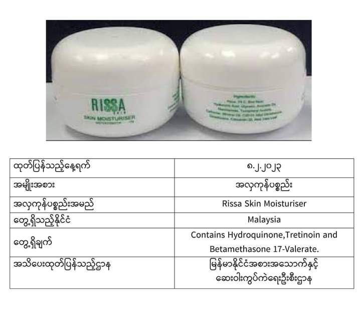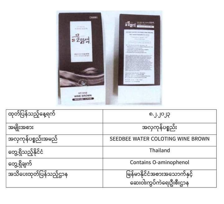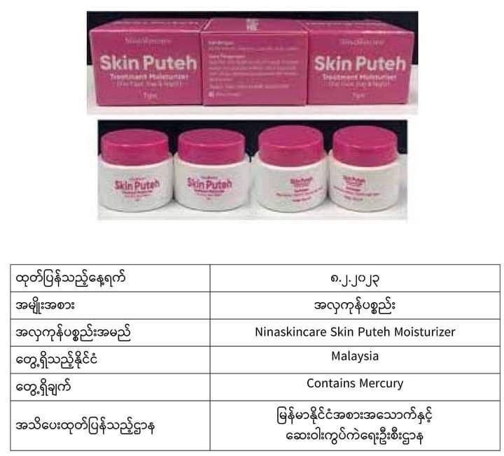 အာဆီယံဒေသတွင်းနိုင်ငံများမှထုတ်လုပ်သည့် အလှကုန်ပစ္စည်းအချို့ကို သုံးစွဲရန်မသင့်ကြောင်း မြန်မာFDA ကအများပြည်သူများသိရှိစေရန် အသိပေးထုတ်ပြန်ထားသည်။