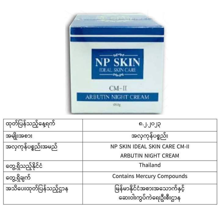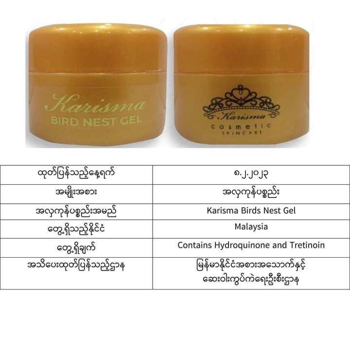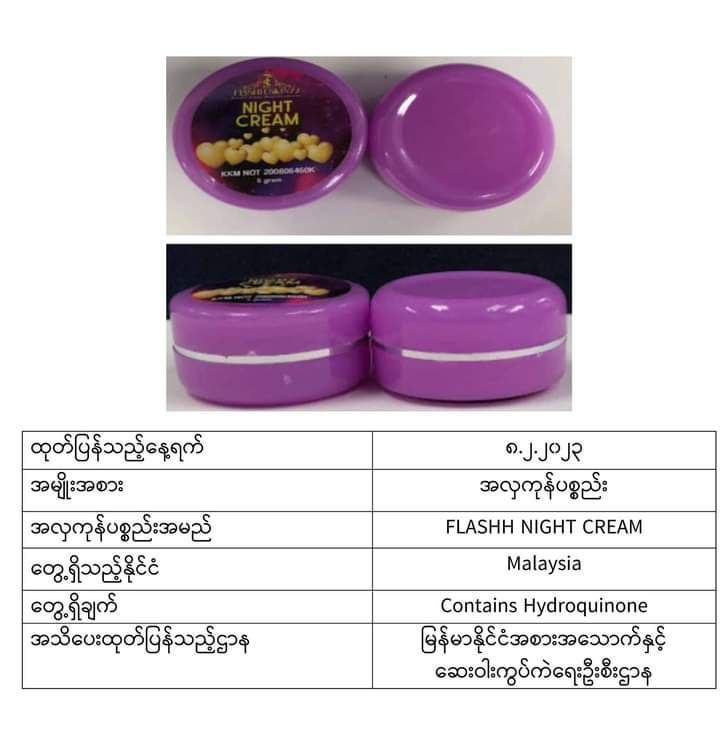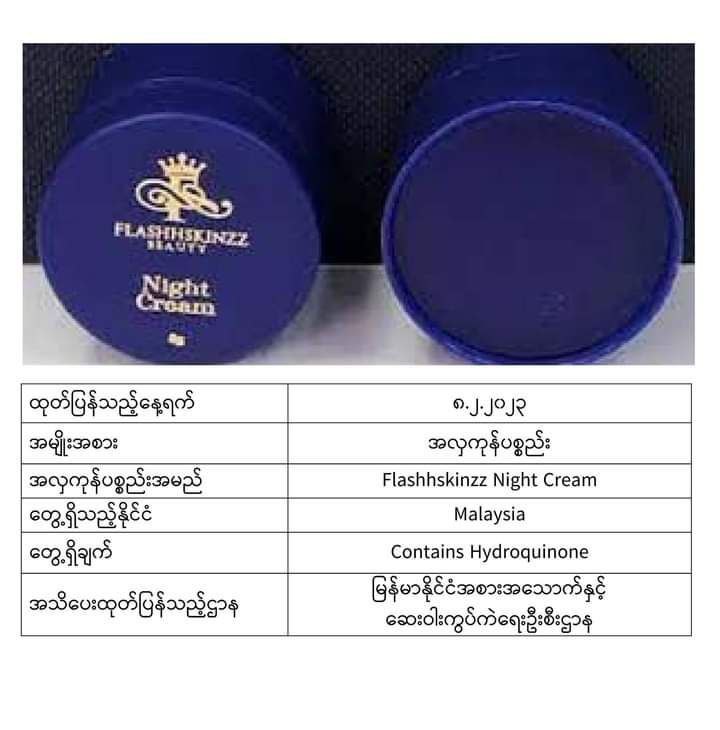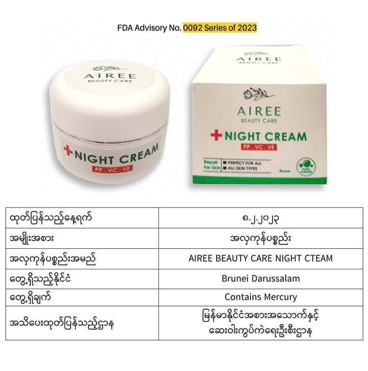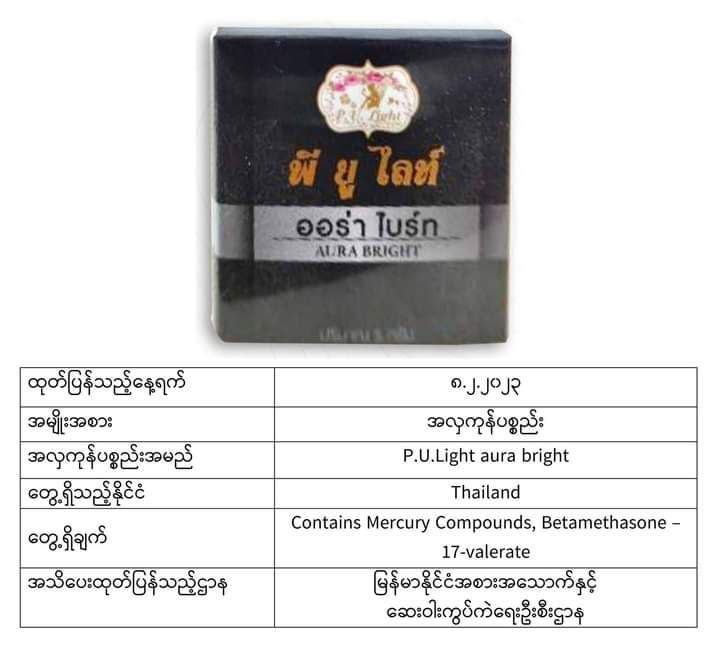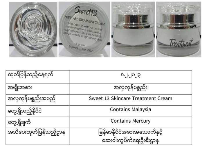 ယင်းအလှကုန်ပစ္စည်းအများစုသည် မလေးရှား၊ အင်ဒိုနီးရှား၊ ထိုင်း၊ ဘရူနိုင်း၊ စင်ကာပူ စသည့်နိုင်ငံများတွင် တွေ့ရသော အလှကုန်များဖြစ်ပြီး မာကျူရီအပါအဝင် ဘေးမကင်းသည့်အရာများပါဝင်သောကြောင့် သုံးစွဲရန်မသင့်ကြောင်း FDA Myanmar မှထုတ်ပြန်အသိပေးလိုက်ခြင်းဖြစ်ကြောင်း သိရသည်။