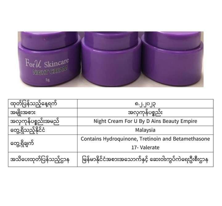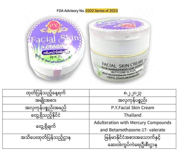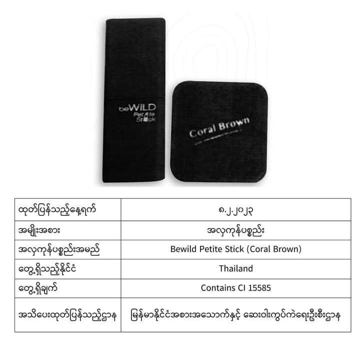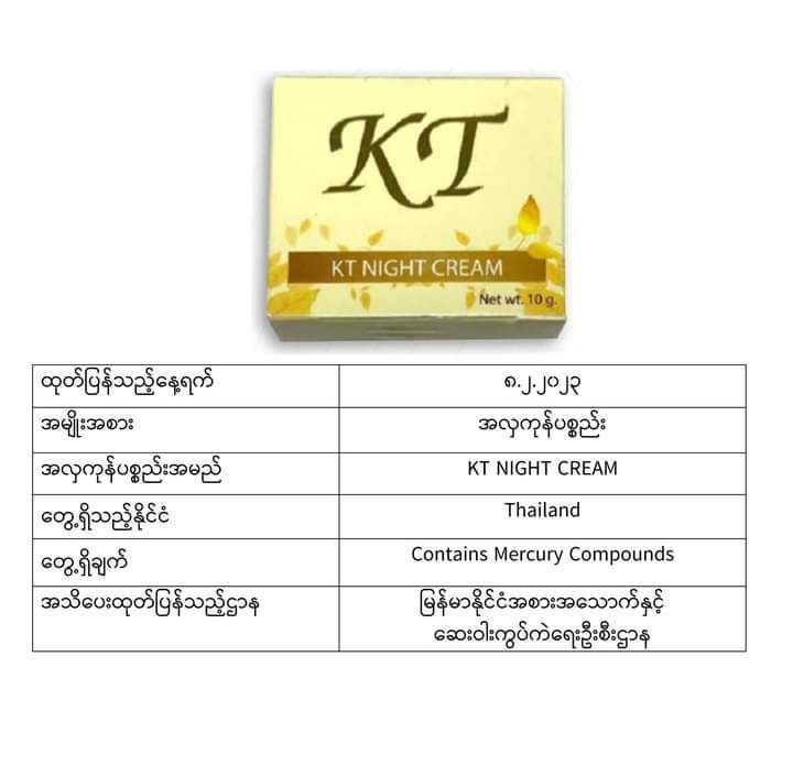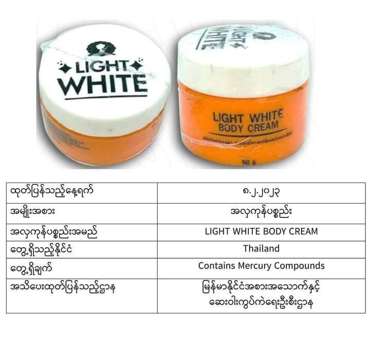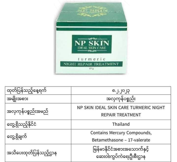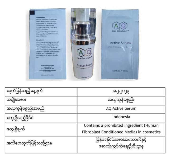 ယင်းအလှကုန်ပစ္စည်းအများစုသည် မလေးရှား၊ အင်ဒိုနီးရှား၊ ထိုင်း၊ ဘရူနိုင်း၊ စင်ကာပူ စသည့်နိုင်ငံများတွင် တွေ့ရသော အလှကုန်များဖြစ်ပြီး မာကျူရီအပါအဝင် ဘေးမကင်းသည့်အရာများပါဝင်သောကြောင့် သုံးစွဲရန်မသင့်ကြောင်း FDA Myanmar မှထုတ်ပြန်အသိပေးလိုက်ခြင်းဖြစ်ကြောင်း သိရသည်။