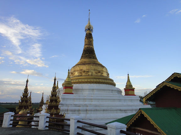 ဓမၸာနဂိုရ္ မင္းၾကီး စိတၱရာဇာႏွင့္ သားေတာ္ ၀ိလာသမင္းသားတုိ႕တည္ထားေတာ္မူေသာ ေရႊက်ီးနား ေစတီေတာ္သည္ ျမန္မာႏွစ္ ၁၁၈၀ ျပည့္ႏွစ္၊ ခရစ္ႏွစ္ ၁၈၁၈ ခုႏွစ္ ဘုိးေတာ္ ဗဒံုမင္းလက္ထက္တြင္ တာပိန္ျမစ္ေရ တုိက္စားသျဖင့္ ေရသို႕လားမည္သကဲ့သို႕ျဖစ္ေလရာ ဗန္းေမာ္ျမိဳ႕၀န္ ဦးအုိးႏွင့္တကြ ဘဒၵႏၱသီလ၀ံသဓဇမဟာဓမၼရာဇာ ဂုရုတံဆိပ္ေတာ္ရ သာသနာျပဳႏြယ္ ျငိမ္းဆရာေတာ္၊ကုန္းခါးဆရာေတာ္၊ေကာင္းဆင့္ဆရာေတာ္ ၊ေညာင္ပင္သာဆရာေတာ္၊ကြန္းၾကီးအလယ္ေက်ာင္းဆရာေတာ္၊ ကမ္းနီဆရာေတာ္၊ စင့္ကင္ဆရာေတာ္၊ေရရွင္ဆရာေတာ္၊ေတာင္လံုးဆရာေတာ္၊ပန္းဘဲကုန္းဆရာေတာ္၊တပ္တြင္းေက်ာင္းဆရာေတာ္ စေသာ သံဃာေတာ္ အရွင္သူျမတ္တုိ႕သည္ ျမိဳ႕နယ္အတြင္းရွိ ဗုဒၶ ဘာသာ၀င္မ်ားအား တိုက္တြန္းႏွဳိးေဆာ္၍  အုိက္ေခါေတာ္ ေစတီ အနီးသို႕ ေျပာင္းေရႊ႕ တည္ထားခဲ့ေလသည္။ဗန္းေမာ္ျမိဳ႕၀န္ ဦးအုိးက ဒါယကာအျဖစ္ခံယူ၍  အုတ္မုခ္၊ အုတ္ေလွ ကား၊အုတ္ျပာသာဒ္၊ တန္ေဆာင္းတုိ႕ကိုပါ တည္ထားလွဴဒါန္းခဲ့သည္။