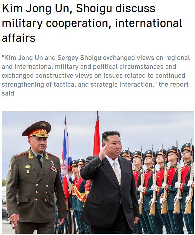“ရဲဘော် ကင်ဂျုံအန်သည် Sergey Shoigu နှင့် ထပ်မံတွေ့ဆုံရခြင်းအတွက် ဝမ်းမြောက်ပါကြောင်း ပြောကြားခဲ့ပြီး နိုင်ငံ၏ အချုပ်အခြာအာဏာနှင့် တိုင်းပြည်ဖွံ့ဖြိုးတိုးတက်ရေး အကျိုးစီးပွားများကို ယုံကြည်စိတ်ချစွာ ကာကွယ်နိုင်သော ရုရှားစစ်တပ်များ၏ ဖွံ့ဖြိုးတိုးတက်မှု၊ ခေတ်မီမှုနှင့် သူရဲကောင်းများကို ချီးကျူးဂုဏ်ပြုခဲ့ပါသည်။ နိုင်ငံတကာ စစ်ရေးနှင့် နိုင်ငံရေး အခြေအနေများ၊ နှစ်နိုင်ငံ တပ်မတော် အကြား နည်းဗျူဟာ နှင့် ဗျူဟာမြောက် အပြန်အလှန် ဆက်ဆံမှု၊ ပူးပေါင်းဆောင်ရွက်မှု နှင့် ကာကွယ်ရေး နှင့် လုံခြုံရေး နယ်ပယ် တို့တွင် အပြုသဘောဆောင်သော အမြင်များ ဖလှယ်ခဲ့ကြသည်” ဟု Voice of Korea သတင်းတွင် ဖော်ပြထားသည်။ .