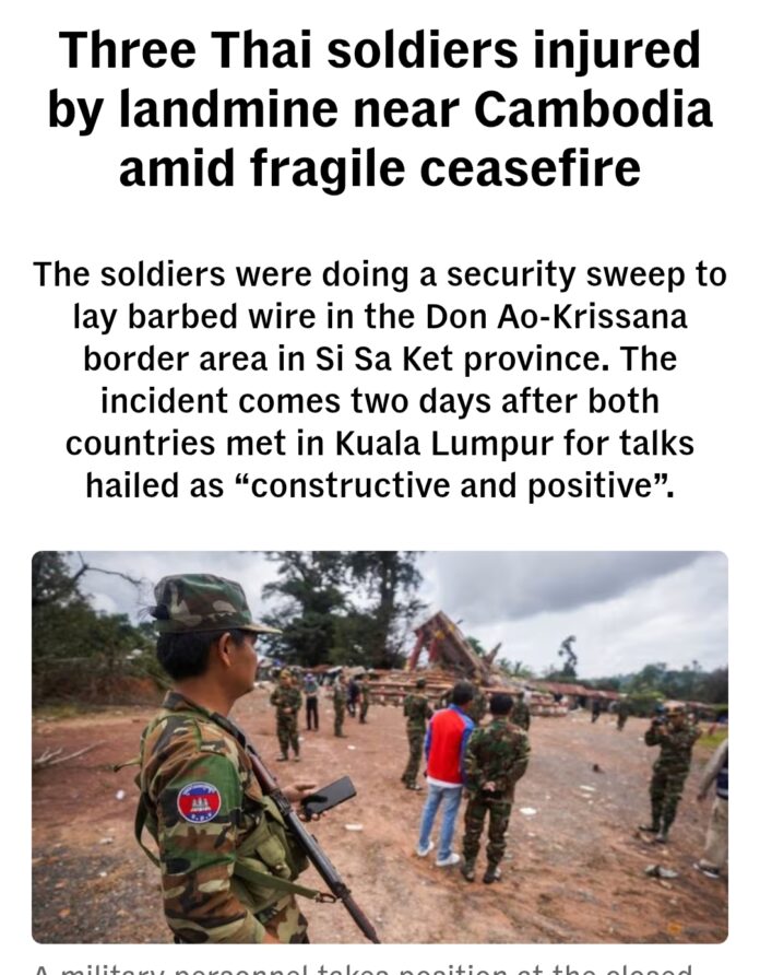 ကေမ္ဘာဒီးယားနိုင်ငံနှင့် နယ်စပ်အနီး ထိုင်းဘက်အခြမ်းတွင် စနေနေ့(သြဂုတ်လ ၉ရက်နေ့) က မြေမြုပ်မိုင်းပေါက်ကွဲ၍ ထိုင်းစစ်သား သုံးဦး ဒဏ်ရာရခဲ့ကြောင်း သိရသည်။ ကွာလာလမ်ပူရ်တွင် နှစ်ဖက်တွေ့ဆုံခဲ့မှုအတွင်း အပြုသဘောဆောင်ပြီး အကျိုးရလဒ်ထွက်ခဲ့သည်ဟု ချီးကျူးပြောဆိုသော ဆွေးနွေးပွဲများအပြီး နှစ်ရက်အကြာတွင် ယခုဖြစ်ရပ် ဖြစ်ပွားခဲ့သည်။