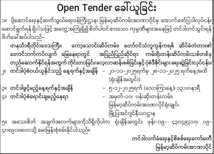 တင်ဒါဖွင့်မည့်နေ့ရက်သည် ဒီဇင်ဘာလ ၅ ရက်နေ့ ဖြစ်ကာ တင်ဒါပုံစံကို အမှတ်-၁၀၊ ပန်းဆိုးတန်းလမ်း၊ မြန်မာ့ဆိပ်ကမ်းအာဏာပိုင်ရုံးချုပ်၌ ဝယ်ယူရမည် ဖြစ်သည်။
