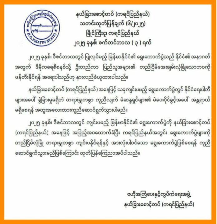 ထို့ပြင် ကရင်ပြည်နယ်အတွင်းရွေးကောက်ပွဲများကို တည်ငြိမ်လုံခြုံတရားမျှတစွာကျင်းပနိုင်ရန်နှင့် အားလုံးပါဝင်သောရွေးကောက်ပွဲဖြစ်စေရန်လည်း ကူညီဆောင်ရွက်ပေးသွားမည်ဟု ထုတ်ပြန်ရေးသားခဲ့သည်။
