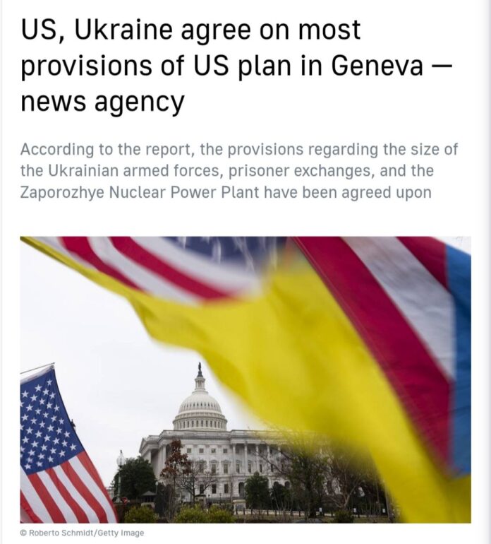 နိုဝင်ဘာလ ၂၃ ရက်နေ့က ဂျီနီဗာ၌ ပြုလုပ်သော အမေရိကန်နှင့် ယူကရိန်း ကိုယ်စားလှယ်အဖွဲ့များ အစည်းအဝေးတွင် ဝါရှင်တန်မှ အဆိုပြုထားသည့် ငြိမ်းချမ်းရေးအစီအစဉ်၏ အချက် ၂၈ ချက်အနက် အများစုကို ယူကရိန်းဖက်မှ သဘောတူညီခဲ့ကြကြောင်း RBC-Ukraine သတင်းဌာနက ၎င်း၏သတင်းရင်းမြစ်များကို ကိုးကား၍ ဖော်ပြသည်။