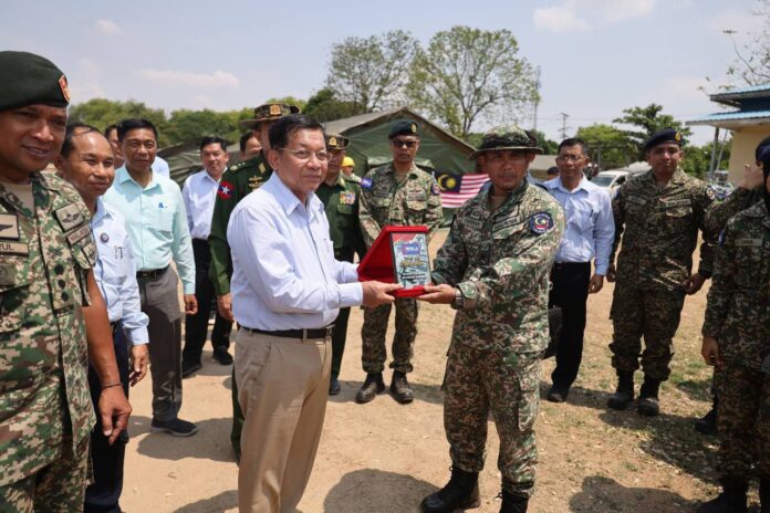 စစ်ကိုင်းတိုင်း၊ စစ်ကိုင်းမြို့ရှိ နှစ်(၇၀၀)ပြည့်အားကစားကွင်းရှိ ယာယီဆေးရုံံ၌ ငလျင်ဒဏ်သင့်သူများအား ကျန်းမာရေးစောင့်ရှောက်ပေးနေသည့် မလေးရှားနိုင်ငံမှ ဆေးကုသရေးအဖွဲ့အား နစက ဥက္ကဋ္ဌ၊ နိုင်ငံတော်ဝန်ကြီးချုပ်၊ ဗိုလ်ချုပ်မှူးကြီးမင်းအောင်လှိုင်မှ ယနေ့ ဧပြီ ၁၉ ရက်နံနက်ပိုင်းက တွေ့ ဆုံခဲ့သည်။