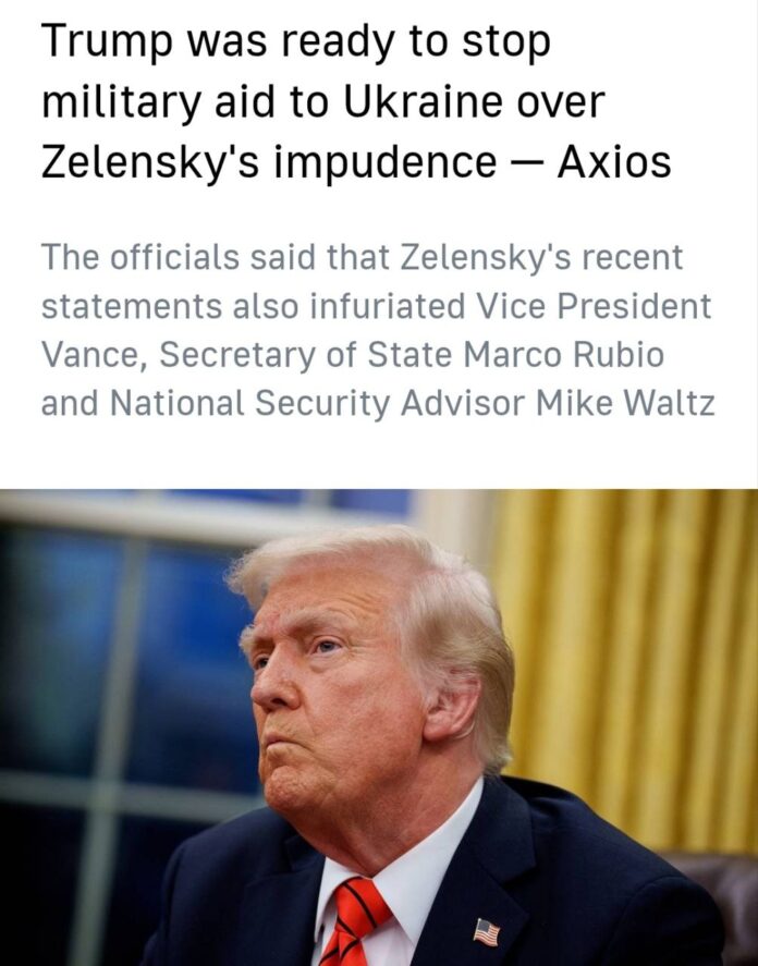 အမေရိကန်သမ္မတ ဒေါ်နယ်ထရမ့်သည် ယူကရိန်းသမ္မတ ဗလာဒီမာ ဇယ်လင်စကီး၏ မကြာသေးမီက ရင့်သီးသော ပြုမူပြောဆိုမှုများကို စိတ်ပျက်လာပြီး ယူကရိန်းသို့ စစ်ရေးအကူအညီ ရပ်ဆိုင်းရန် အသင့်ပြင်ထားကြောင်း ယင်းအခြေအနေနှင့် နီးစပ်သော အမေရိကန်အရာရှိ ၃ ဦးက ပြောကြားခဲ့သည်။