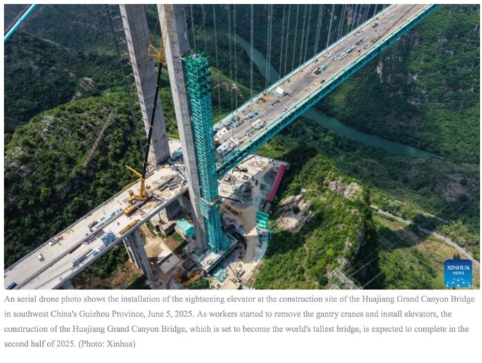 တံတားကို ၂၀၂၁ ခုနှစ်တွင် စတင်တည်ဆောက်ခဲ့ပြီး Liuzhi-Anlong အမြန်လမ်းပေါ်ရှိ ကမ္ဘာ့အမြင့်ဆုံးတံတားဟွာကျန်း ဂရင်းကင်ညွန်တံတားကြီးသည် မြစ်အထက် ၆၂၅ မီတာအမြင့်တွင်တည်ရှိပြီး ပြည်နယ်အတွင်းမှာပင်ရှိသည့် အမြင့် ၅၆၅ မီတာရှိ Beipanjiang တံတားသည် လက်ရှိတွင် ကမ္ဘာ့ဒုတိယအမြင့်ဆုံးတံတားဖြစ်သွားခဲ့သည်။