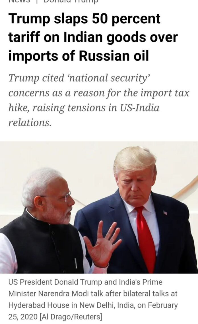 အိန္ဒိယအစိုးရသည် လက်ရှိတွင် ရုရှားဖက်ဒရေးရှင်းနိုင်ငံမှ ရေနံကို တိုက်ရိုက် သို့မဟုတ် သွယ်ဝိုက်၍ တင်သွင်းနေသည်ဟုလည်း ထရမ့်ပ်က ရေးသားခဲ့သည်။