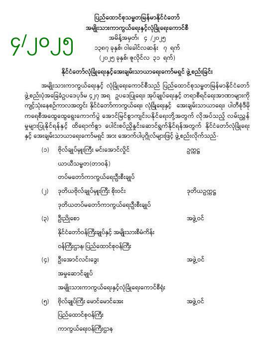ယင်းကော်မရှင်တွင် ဗိုလ်ချုပ်မှူးကြီး မင်းအောင်လှိုင် ယာယီသမ္မတ(တာဝန်) တပ်မတော်ကာကွယ်ရေး ဦးစီးချုပ်က ဥက္ကဋ္ဌ၊ ဒုတိယဥက္ကဋ္ဌ အဖြစ် ဒုတိယဗိုလ်ချုပ်မှူးကြီး စိုးဝင်း ဒုတိယတပ်မတော်ကာကွယ်ရေးဦးစီးချုပ်၊ အဖွဲ့ဝင်များအ ဖြစ် နိုင်ငံတော်ဝန်ကြီးချုပ်နှင့် အမျိုးသားစီမံကိန်း ဝန်ကြီး ဌာန၊ ပြည်ထောင်စုဝန်ကြီး နိုင်ငံတော်ဝန်ကြီးချုပ်နှင့် အမျိုး သားစီမံကိန်း ဝန်ကြီးဌာန၊ ပြည်ထောင်စုဝန်ကြီးဦးညိုစော၊ အမှုဆောင်ချုပ် အမျိုးသားကာကွယ်ရေးနှင့် လုံခြုံရေးကောင်စီရုံး ဦးအောင်လင်းဒွေး ၊ပြည်ထောင်စုဝန်ကြီး ကာ ကွယ်ရေးဝန်ကြီးဌာန ဗိုလ်ချုပ်ကြီး မောင်မောင်အေး ပြည် ထောင်စုဝန်ကြီး ကာကွယ်ရေးဝန်ကြီးဌာန ၊ဒုတိယဗိုလ်ချုပ်ကြီး ထွန်းထွန်းနောင်၊ ပြည်ထဲရေးဝန်ကြီးဌာန ပြည်ထောင်စုဝန်ကြီး၊ နိုင်ငံခြားရေးဝန်ကြီးဌာန ပြည်ထောင်စုဝန်ကြီး၊ န ယ်စပ်ရေးရာဝန်ကြီးဌာန ပြည်ထောင်စုဝန်ကြီး ဒုတိယဗိုလ် ချုပ်ကြီး ရာပြည့်၊ ညှိနှိုင်းကွပ်ကဲရေးမှူး(ကြည်း၊ ရေ၊ လေ) ဗိုလ်ချုပ်ကြီးကျော်စွာလင်း၊ တွဲဖက်အမှုဆောင်ချုပ် အတွ င်းရေးမှူးဗိုလ်ချုပ်ကြီး ရဲဝင်းဦးတို့ပါဝင်ကြောင်း သိရသည်။