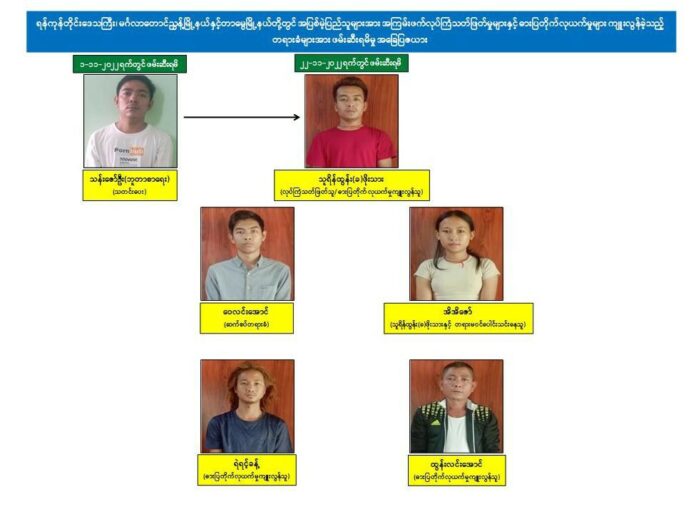 ထို့ကြောင့် နိုဝင်ဘာ ၂၂ ရက်ညနေပိုင်းတွင် ပြစ်မှုကျူးလွန်ရာတွင်ပါဝင်သည့် သူရိန်ထွန်း(ခ)ဖိုးသား၊အိအိဇော်နှင့်ဝေလင်းအောင်တို့အား ဖမ်းဆီးရမိခဲ့ပြီး စစ်ဆေးချက်အရ ယင်းနေ့ညပိုင်း၌ ရဲရင့်ခန့်နှင့် ထွန်းလင်းအောင် တို့ကိုလည်းထပ်မံဖမ်း ဆီးရမိခဲ့သည်။